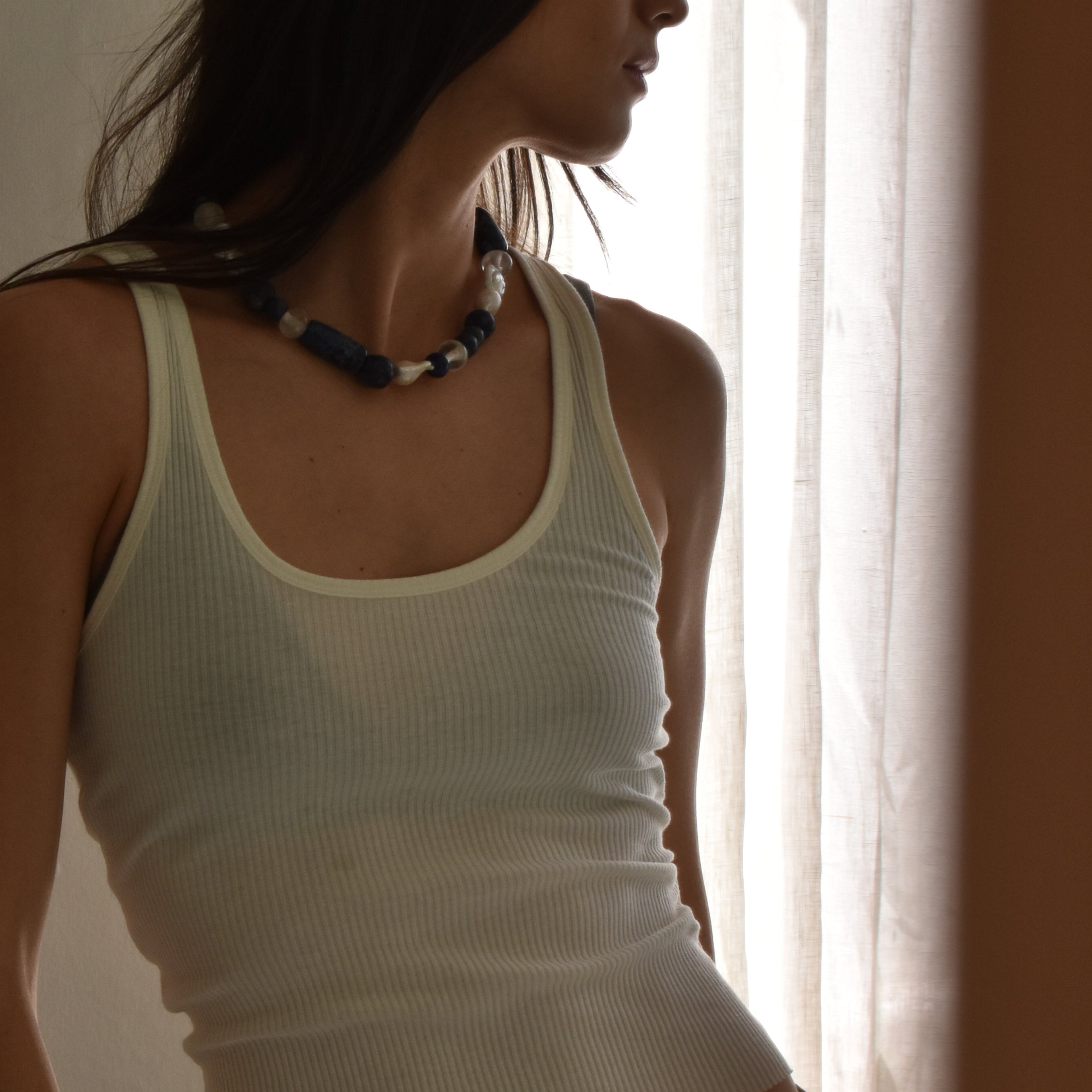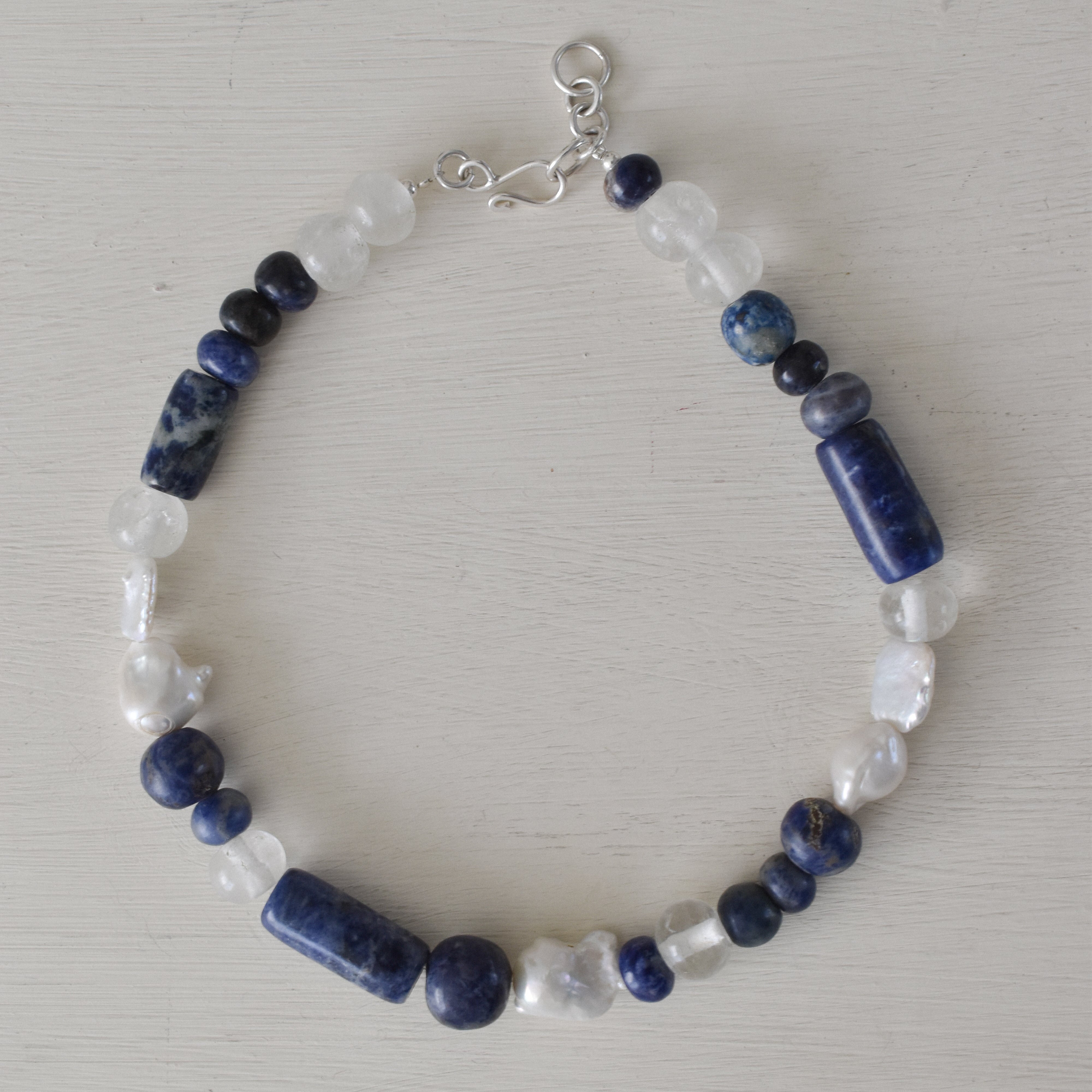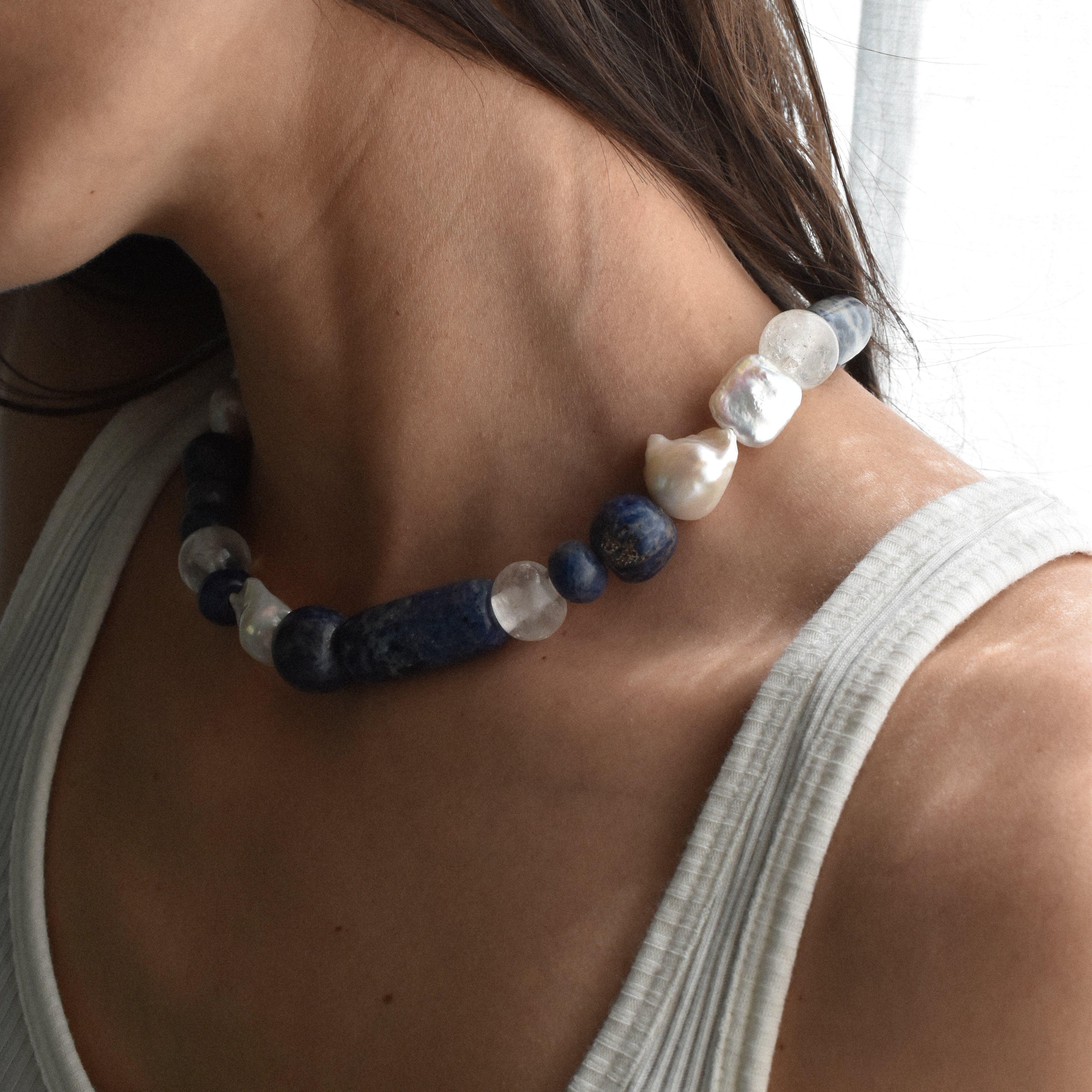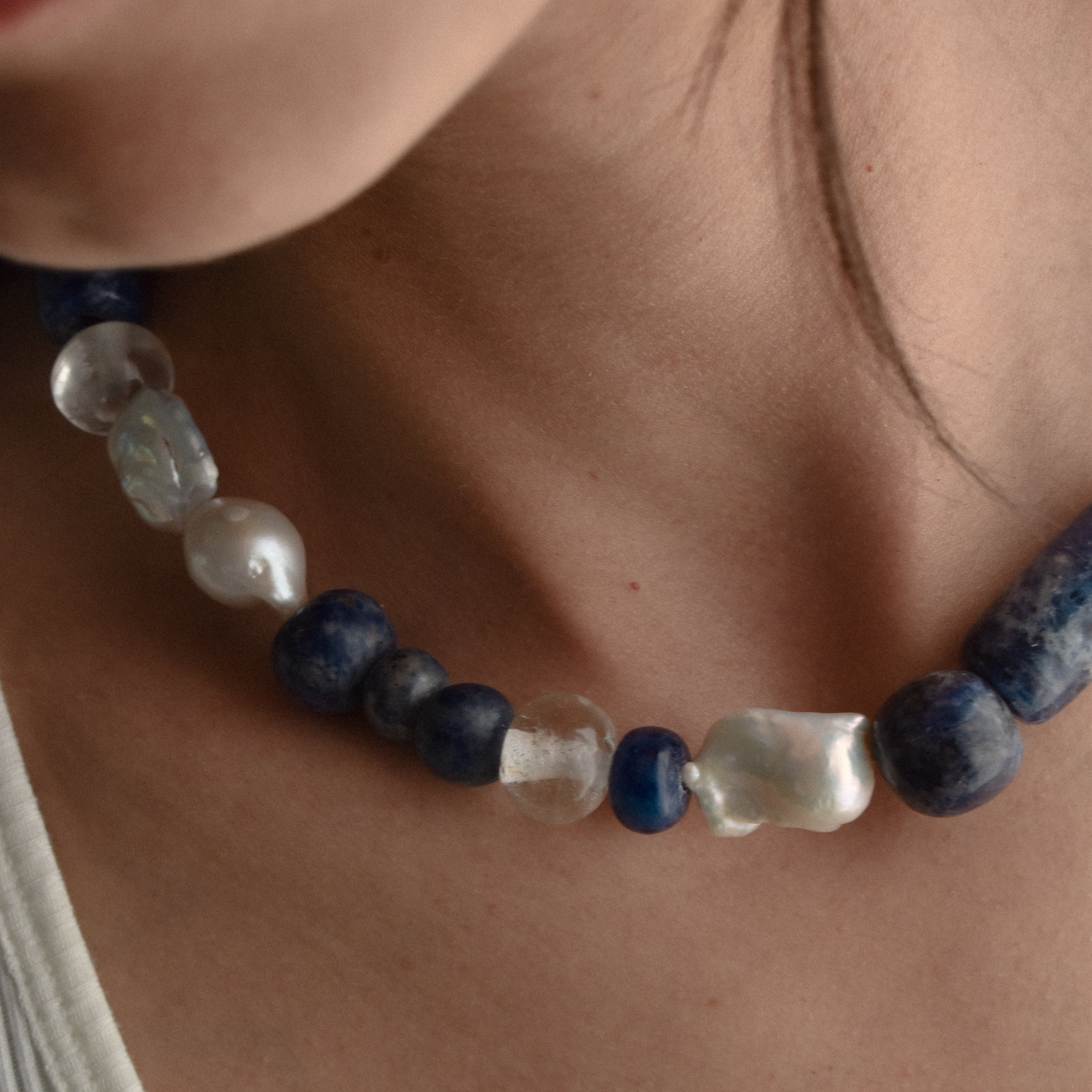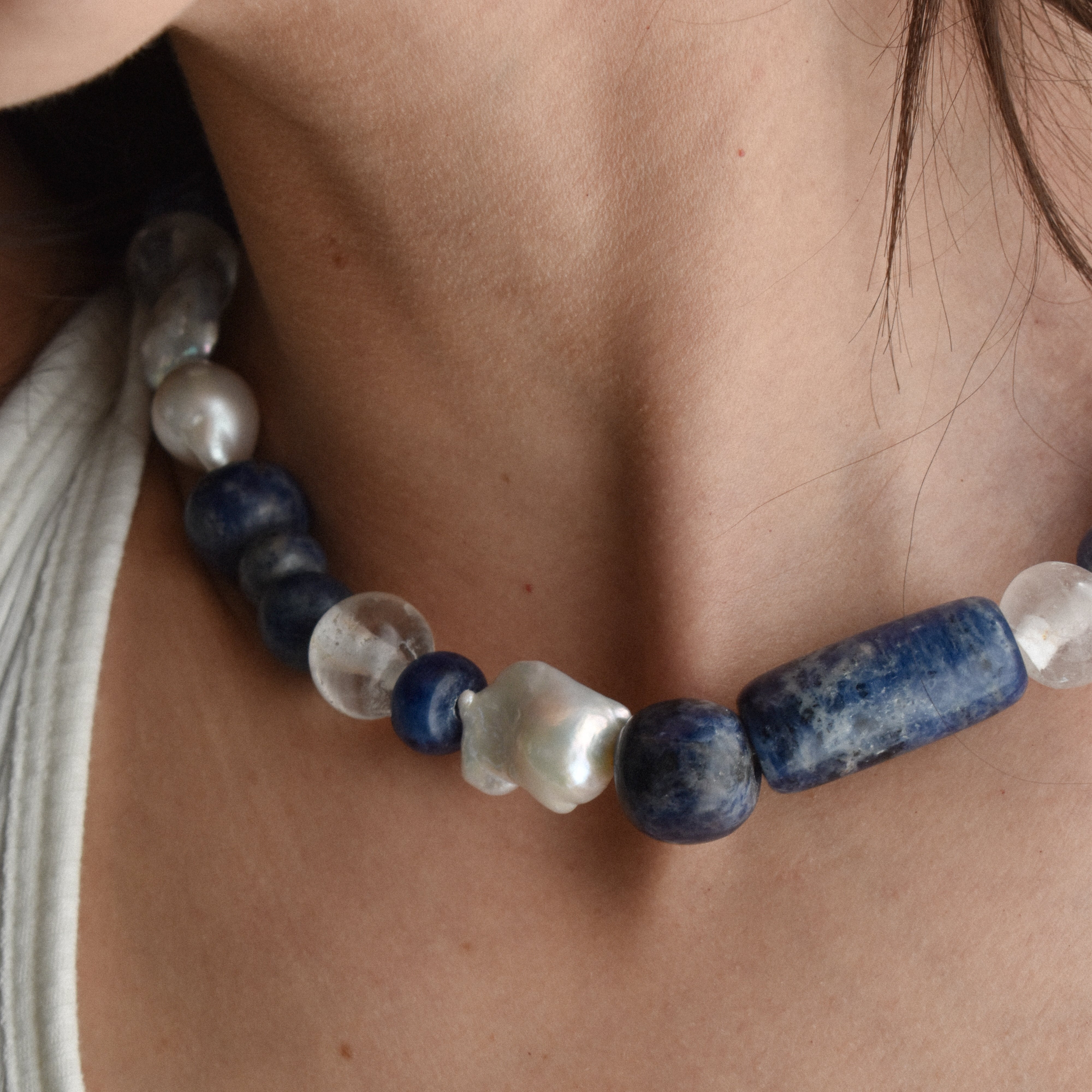 Piedra sodalita, cristal de cuarzo, perlas barrocas y broche de plata 925 -