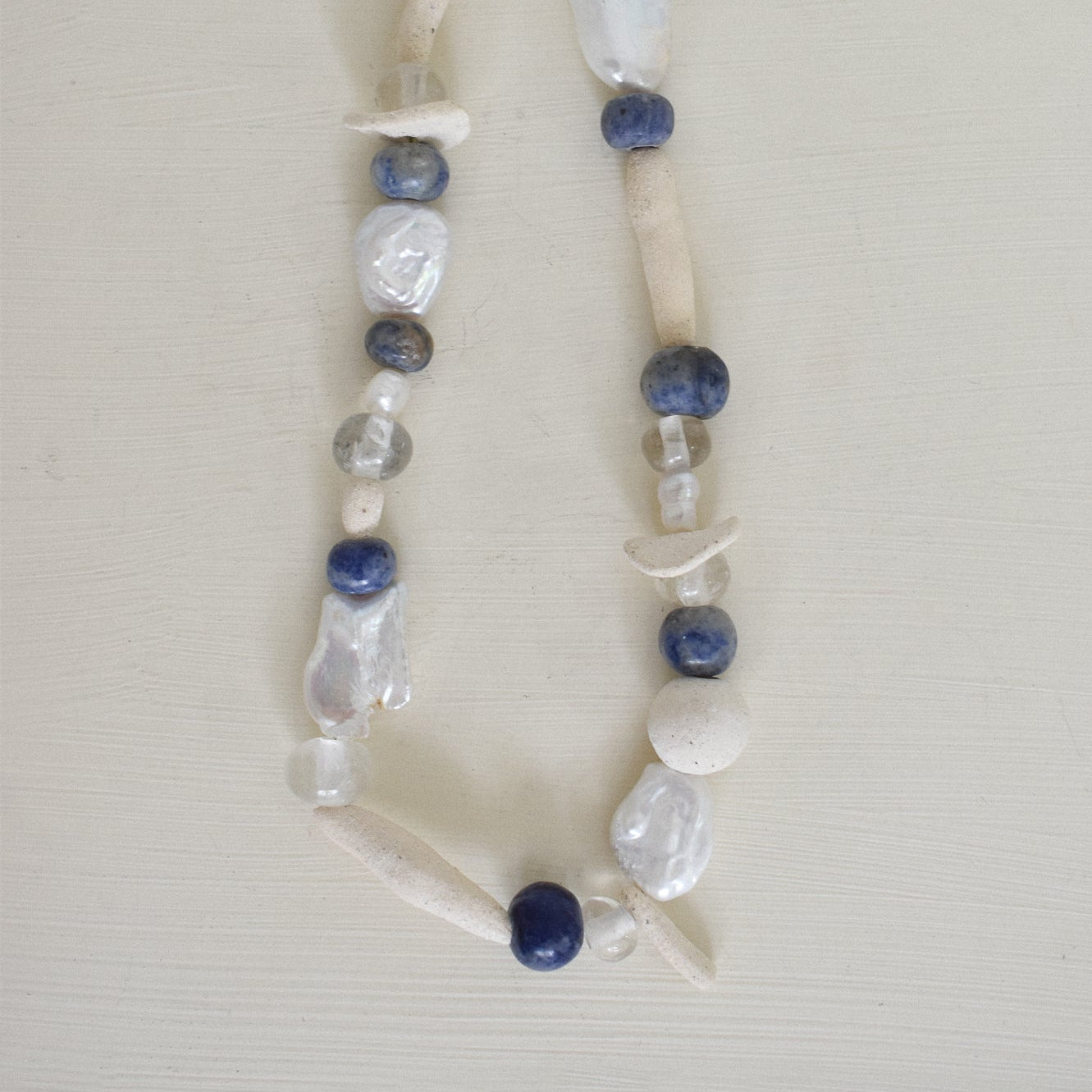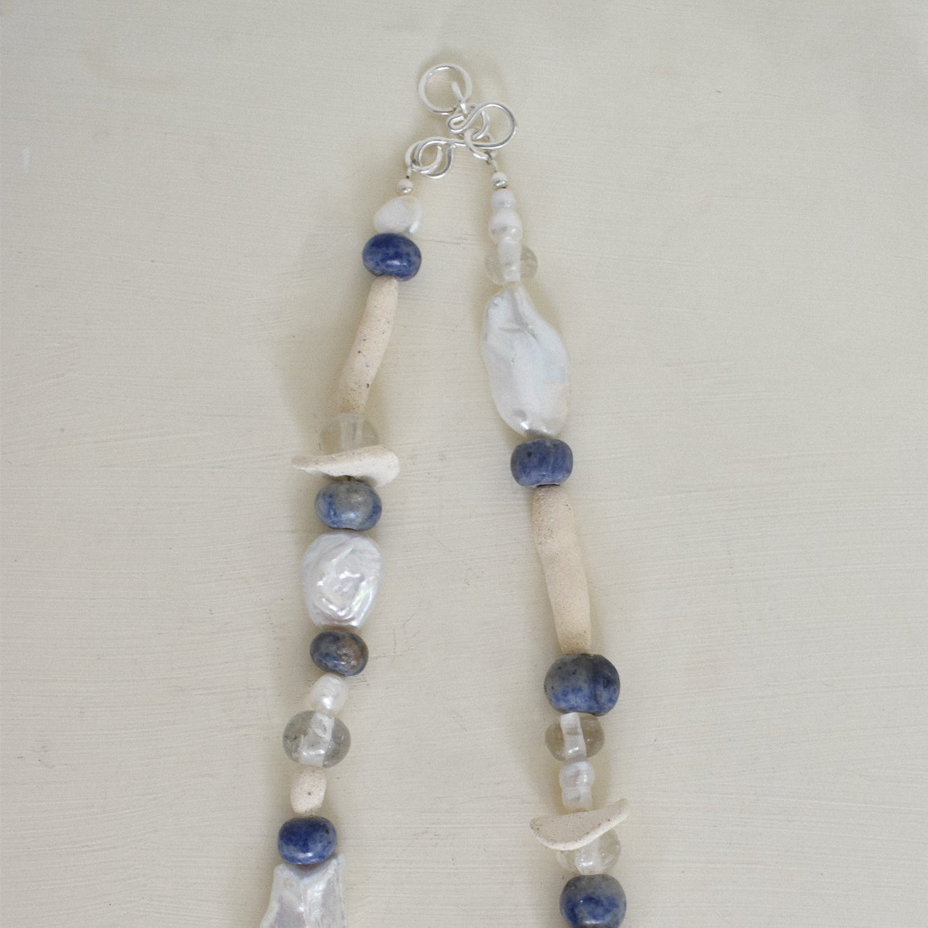 One of a kind - Piedra sodalita, barro zacatecas trabajado a mano en nuestro estudio, cristal de cuarzo, perlas barrocas y broche de plata 925.