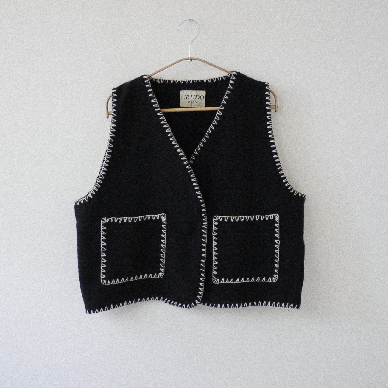Este chaleco es nuestra primera pieza de indumentaria, realizado con hilos 100% algodón tejido en telar de pedal, trabajado en la Sierra Norte de Puebla, los hilos utilizados para el bordado del contorno son de lana.