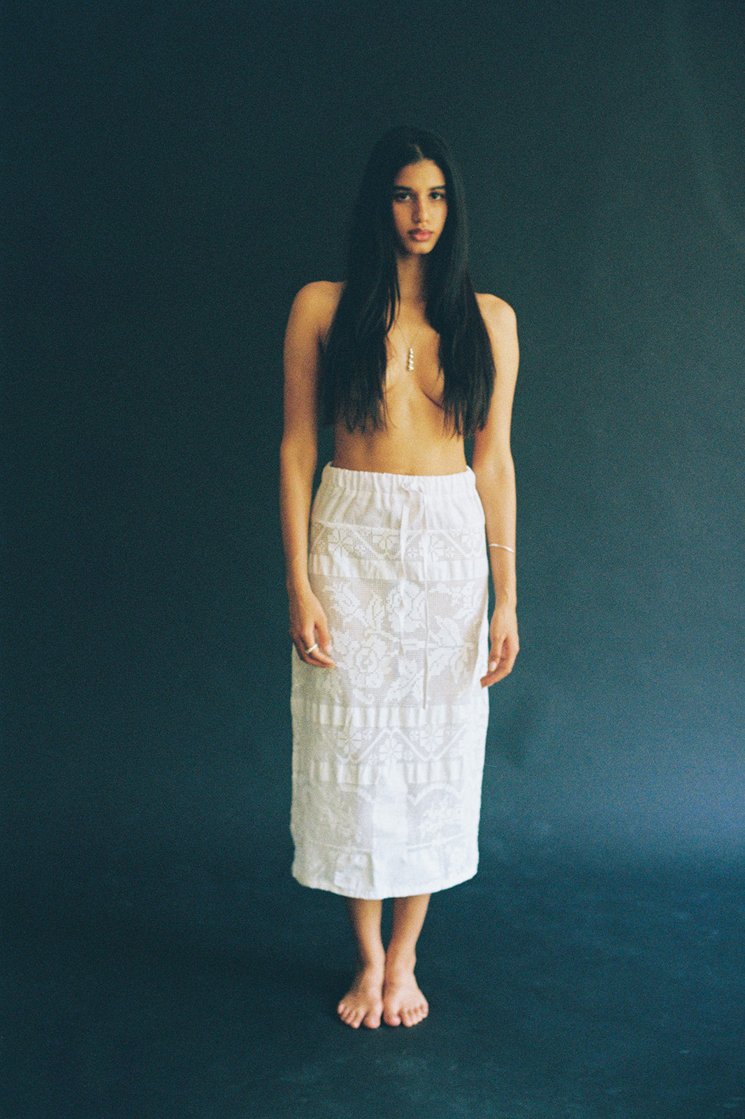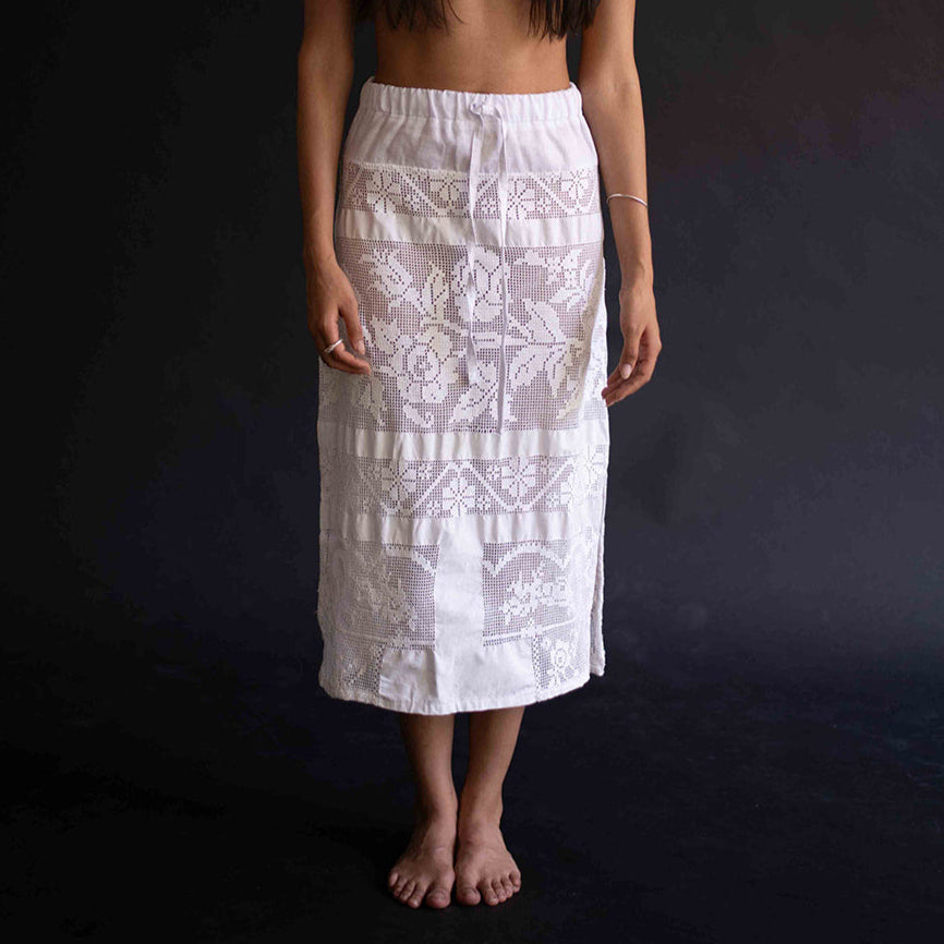 One-of-a-kind skirt made of cotton with hand embroidery. Adjustable with side ties. One size fits most.