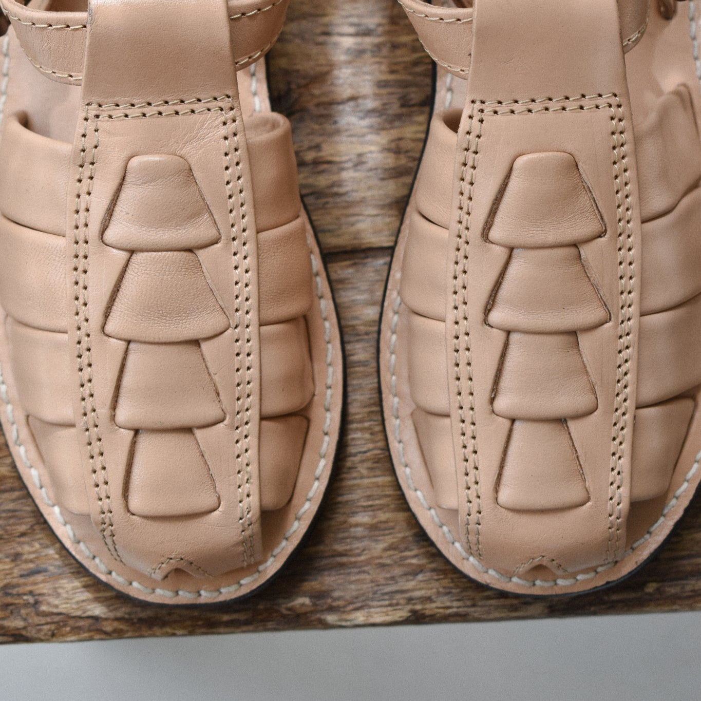 Sandalias de cuero con base cuadrada, trabajadas en el taller familiar mexicano. Cada etapa del proceso se realiza manualmente y en pequeñas cantidades..