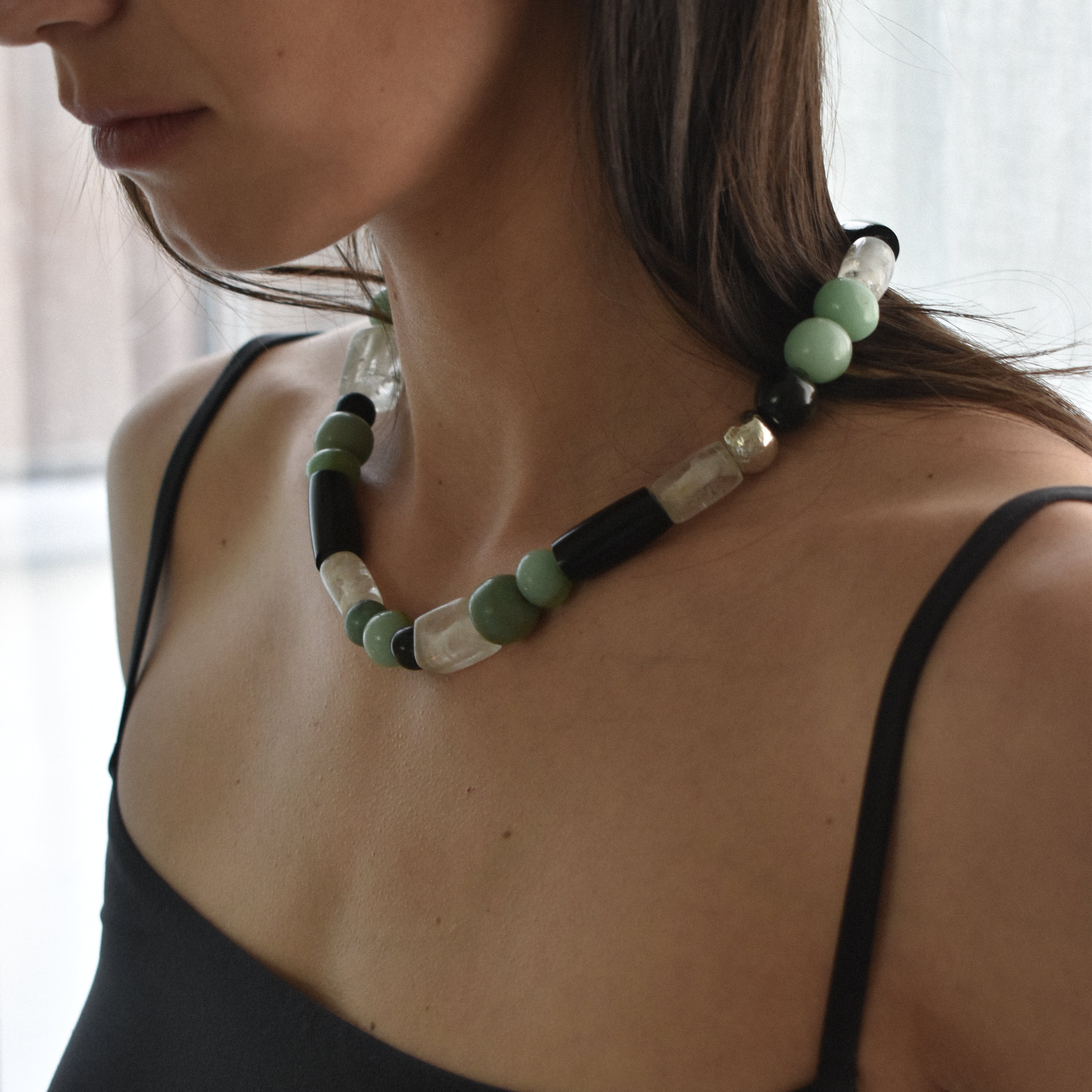 Piedra jade, jadeita, barro zacatecas, tubos de ónix poblano, obsidiana del Edo. de México, plata 925 y cuero con broche tejido con estambre.