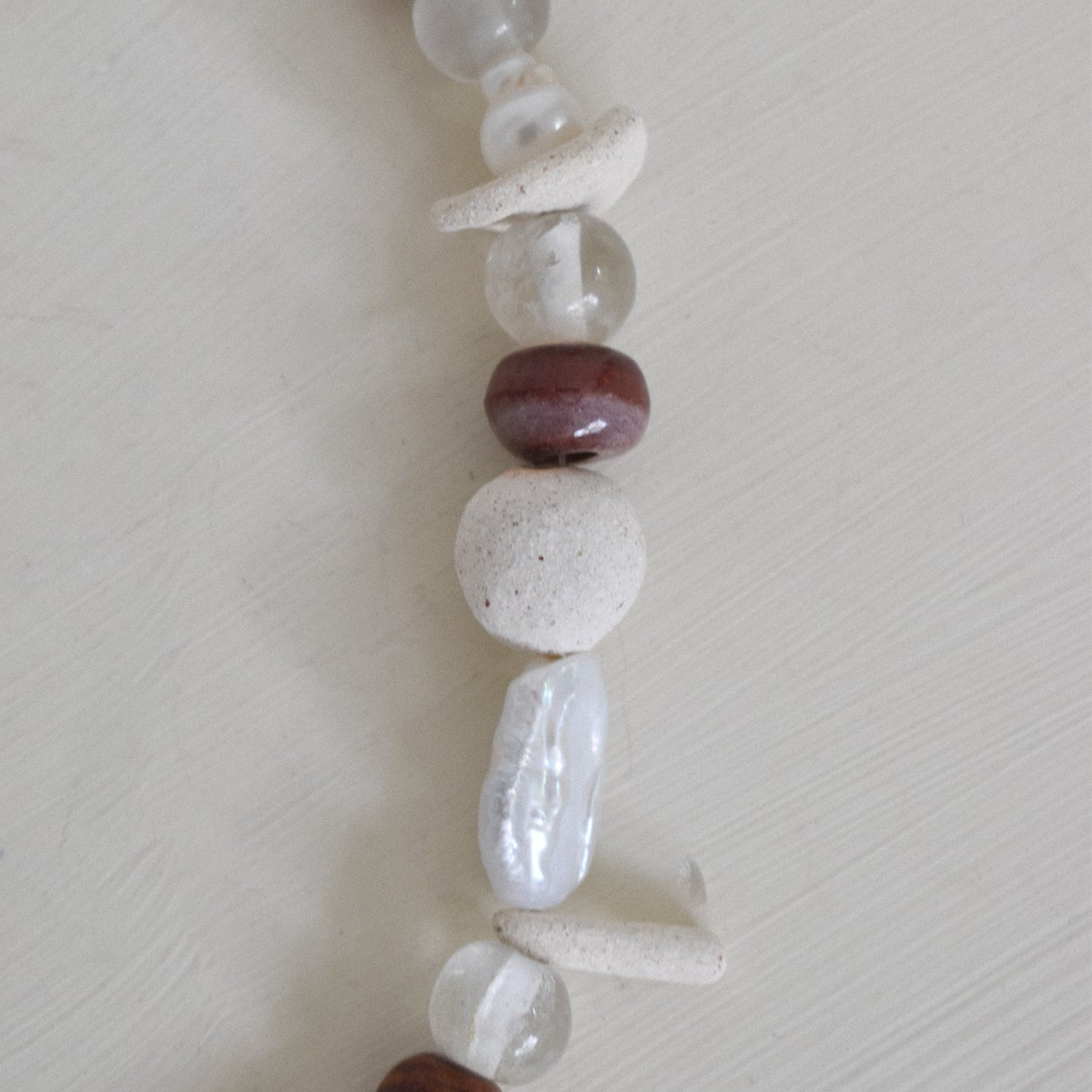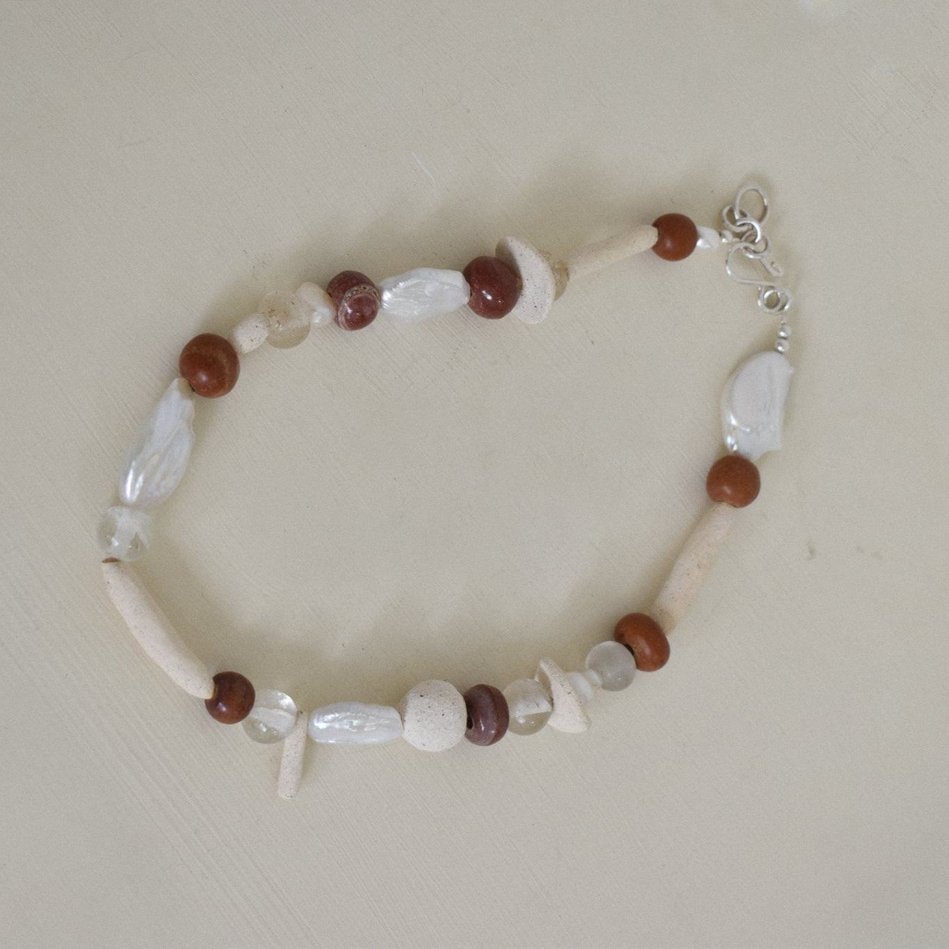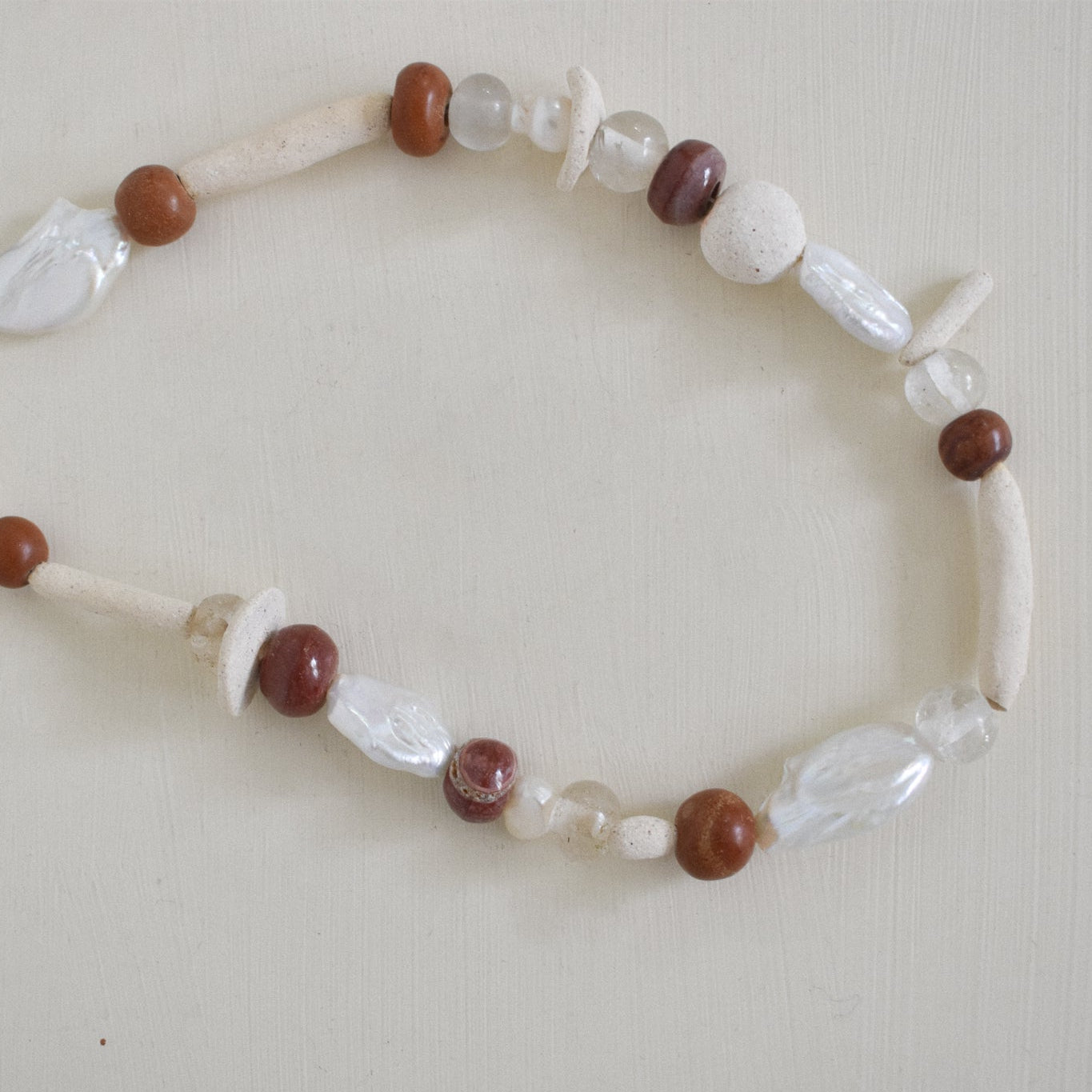 One of a kind - Piedra jaspe, barro zacatecas trabajado a mano en nuestro estudio, cristal de cuarzo, perlas barrocas y broche de plata 925.