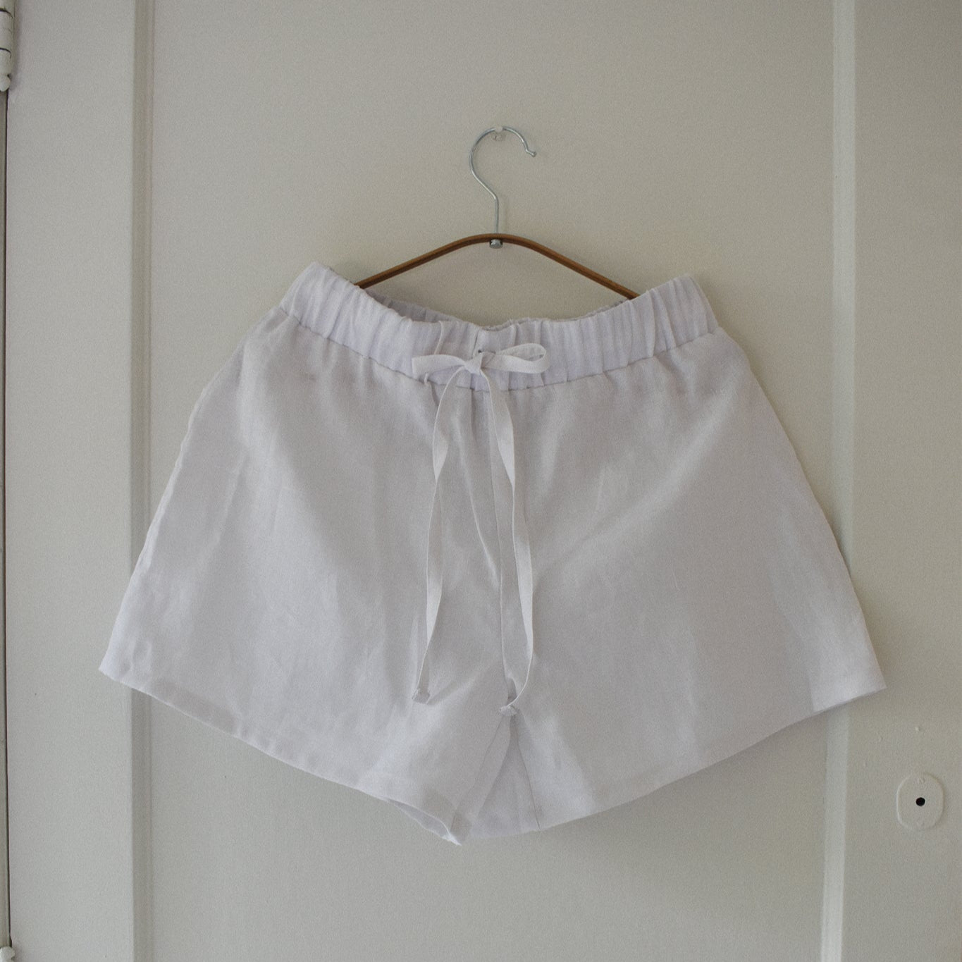 White linen shorts with an elastic waistband and drawstring. Carefully made in our studio. Each garment is unique and individually crafted in size S.