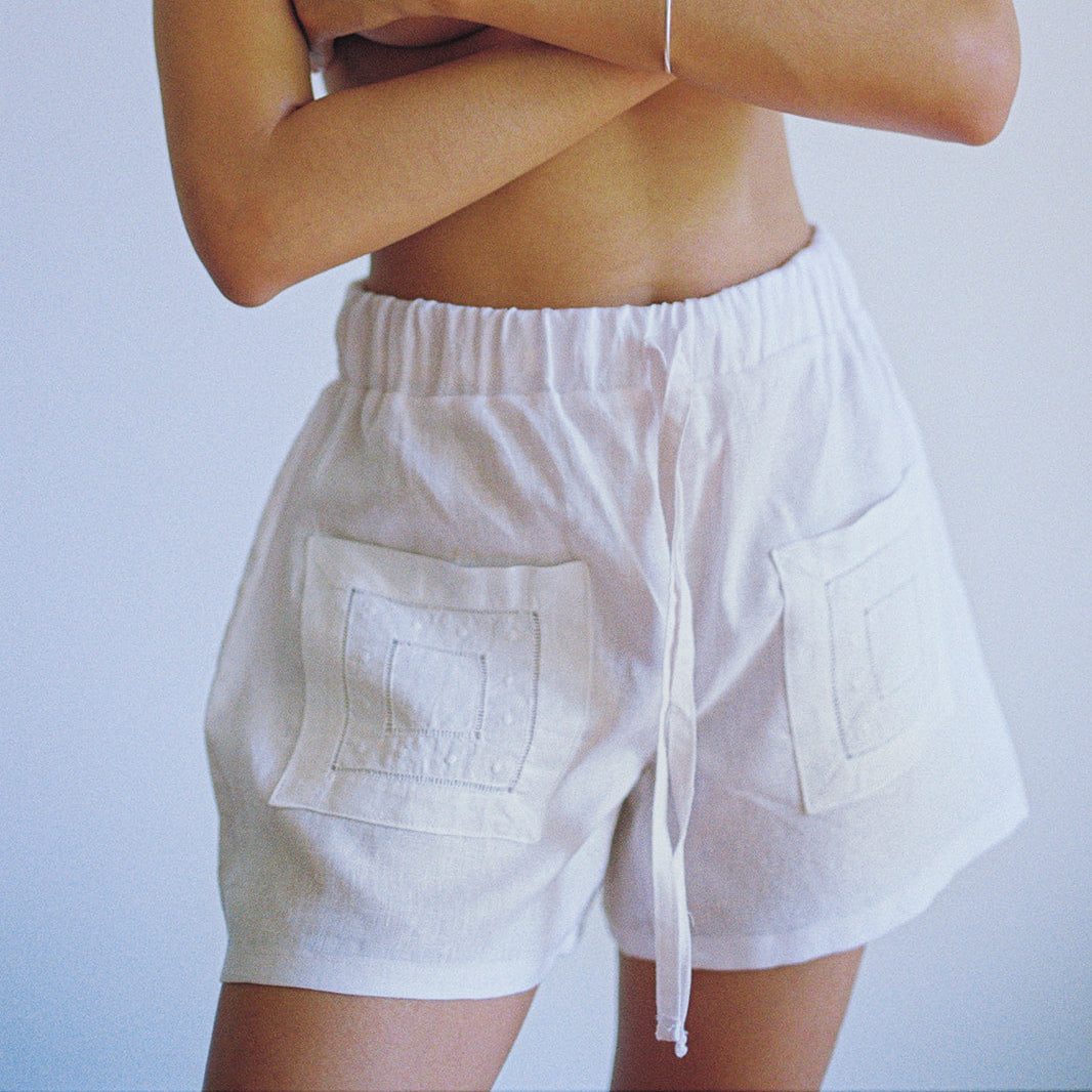 Short de lino blanco con cintura elástica y jareta. Confeccionado cuidadosamente en nuestro estudio. Cada prenda es única, trabajada individualmente esta pieza es talla S.
