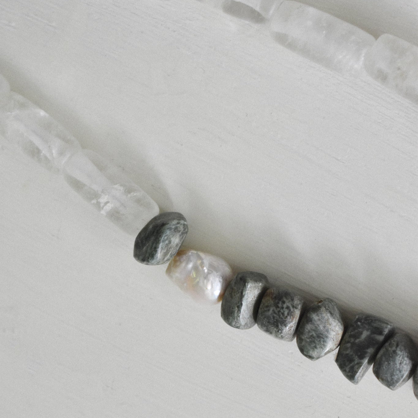 Jadeita, cristal de piedra, perla barroca y plata 925.