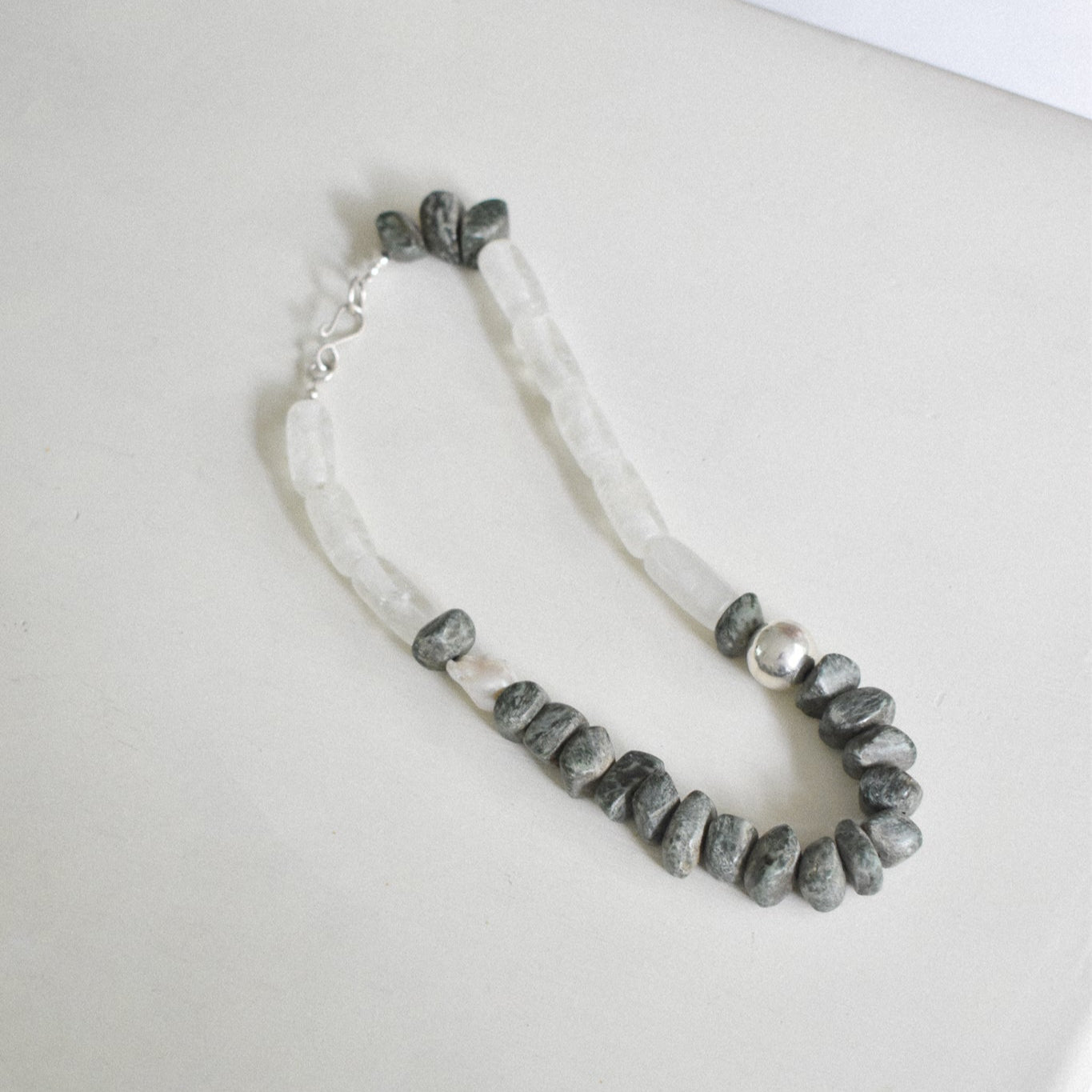 Jadeite, stone crystal, baroque pearl and sterling silver 925.